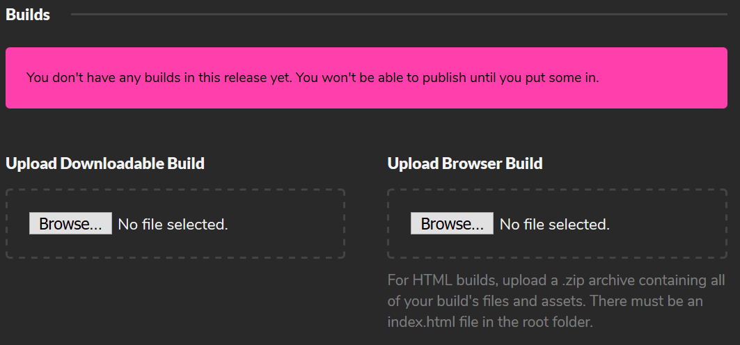 Two options, namely, Upload Downloadable Build and Upload Browser Build, will be available here. The downloadable build is for distributing executable files that can run on the system. Since you want your game to be playable in the browser, click on Browse under the Upload Browser Build option and select the .zip HTML5 package that you had created before.
